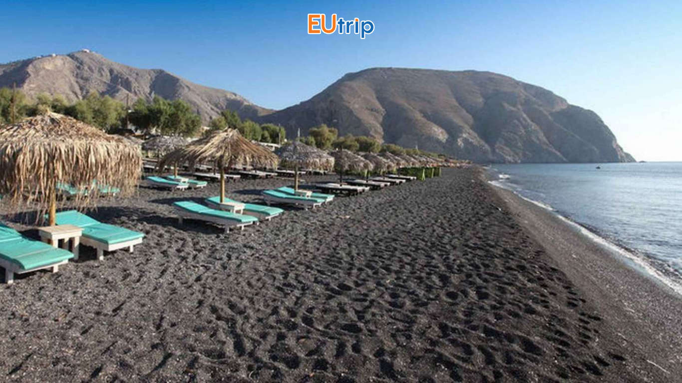 Äịa chất núi lá»a độc Ä‘áo cá»§a Santorini Ä‘ã tạo nên bãi cát Ä‘en đặc trưng tại Kamari. Bãi biển dài vá»›i cát Ä‘en được hình thành từ tro núi lá»a sau các đợt phun trào, là Ä‘iểm nghỉ dưỡng nổi tiếng ở phía Ä‘ông đảo Santorini.