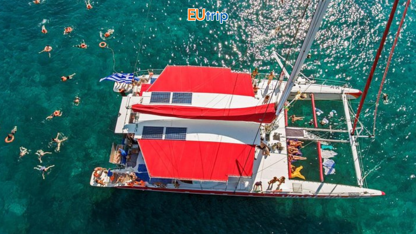 Sau Ä‘ó, quý khách sẽ được thưởng thức bữa ăn tươi ngon vá»›i hải sản địa phương và tiệc nướng BBQ. Quầy bar mở phục vụ các loại đồ uống cÅ©ng sẵn sàng. Trước khi quay vá» cảng và kết thúc hành trình, hãy chiêm ngưỡng toàn cảnh Santorini cùng làn nước trong xanh cá»§a biển Aegean.